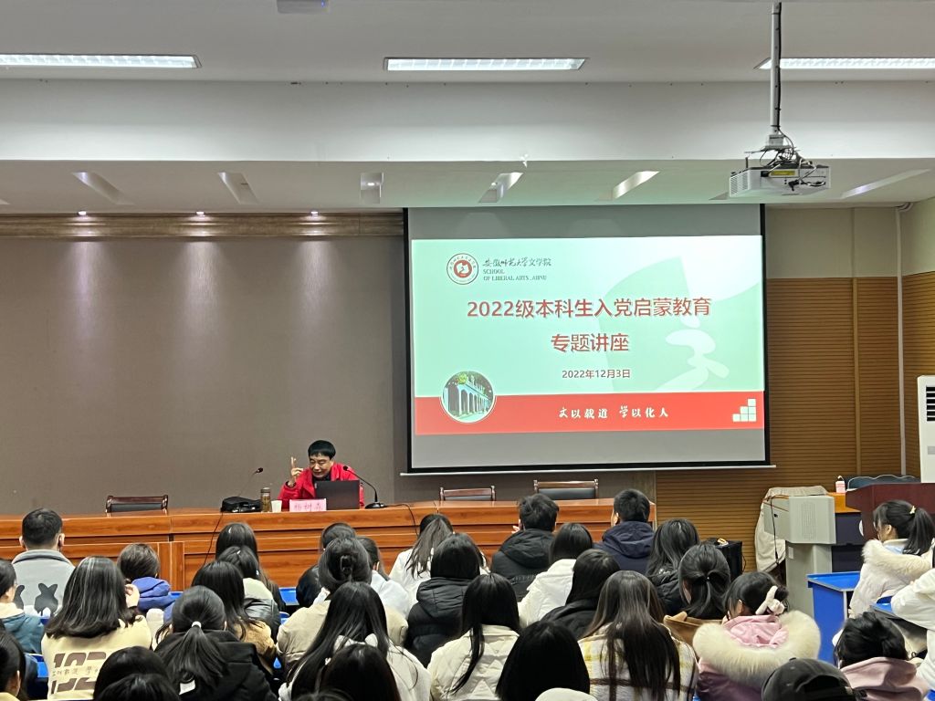 学院邀请退休教师杨树森教授、党委副书记刘飞分别为2022级汉语言文学专业和中国语言文学类各班级作入党启蒙专题报告。杨树森教授作为一名“光荣在党50年”老党员,讲述了自己对大学生入党的看法,他认为入党是一件光荣而神圣的事情,也意味着需要承担更多的责任。他勉励同学们积极向党组织靠拢,期望青年学子努力为党和国家的发展做出贡献。