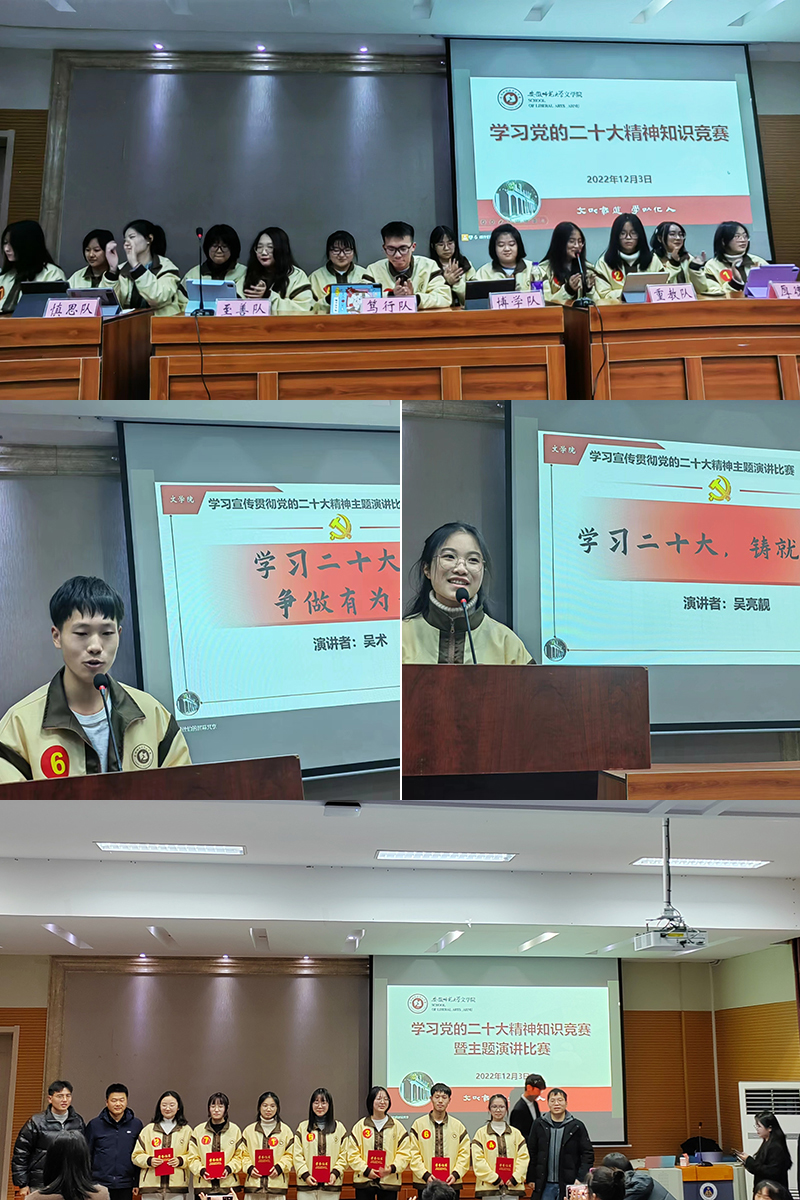 为带领广大青年学子深入学习宣传贯彻党的二十大精神,12月3日,学院举办学习党的二十大精神知识竞赛暨主题演讲比赛活动,掀起青年团员学习二十大精神的热潮。本次比赛既是对参赛选手学习二十大精神和党史学习教育成果的集中检验,又是学生们学史鉴今的生动课堂。学院通过青年团员喜欢的语言、形式和故事,感染青年、激励青年,推动广大青年学子根植红色基因。