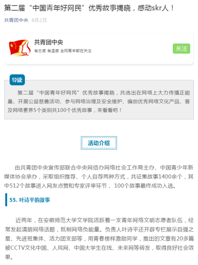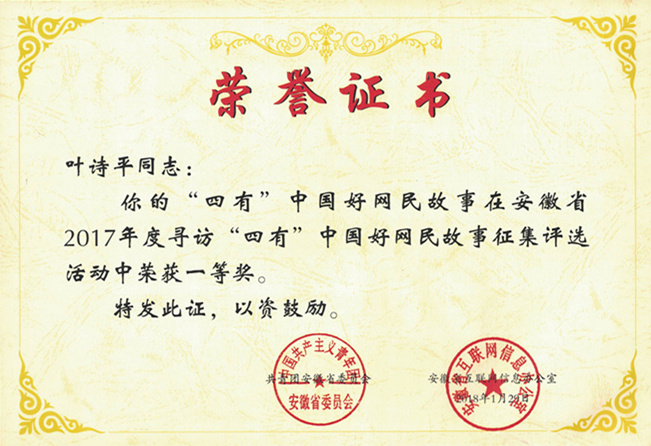 8月,由共青团中央、中央网信办联合举办的第二届“中国青年好网民”优秀故事征集活动结果揭晓。必赢线路检测3003no12015级秘书学专业学生叶诗平的故事经过初审、网友点赞及专家评审等环节,从全国1400余个故事中脱颖而出,入选100个优秀故事。此前,叶诗平荣获安徽省“四有”好网民故事一等奖。