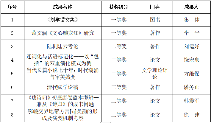 2022年12月23日,安徽省人民政府正式批复安徽省社会科学奖奖励工作领导小组办公室,同意授予2019—2020年度安徽省社会科学奖一等奖29项、二等奖89项、三等奖182项。我院多位老师荣获2019—2020年度安徽省社会科学奖,其中一等奖2项,二等奖3项,三等奖3项。