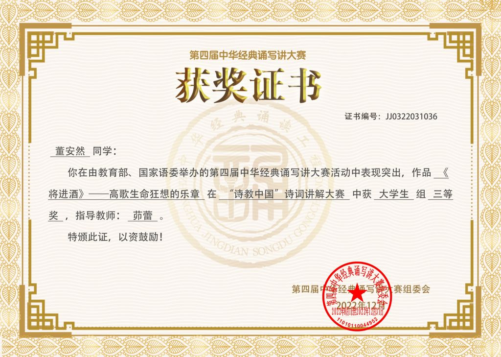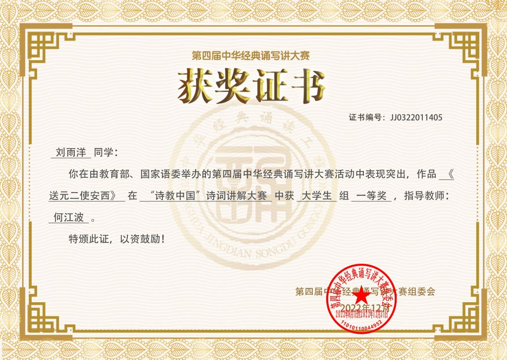 近日,由教育部、国家语委主办的第四届中华经典诵写讲大赛“迦陵杯·诗教中国”诗词讲解大赛结果正式公布,必赢线路检测3003no12021级汉语言文学(师范)专业刘雨洋同学荣获一等奖,也是安徽省唯一一个一等奖。此外,2020级汉语言文学(非师范)专业董安然同学荣获三等奖,2019级汉语言文学专业陈欢、2020级汉语言文学(非师范)专业张新濡两位同学获得优秀奖,四位学生同时获奖,为近年来我校在该项赛事上取得的最好成绩。