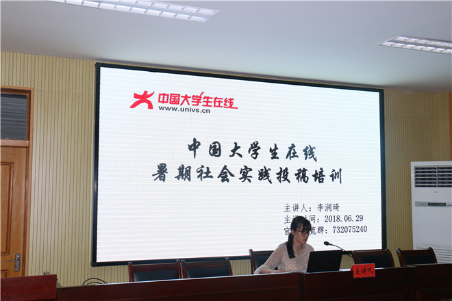 中国大学生在线校网通站副站长李润琦带来中国大学生在线投稿培训。她简要介绍了中国大学生的平台和栏目,点明投稿流程,并对投稿细则进行详细讲述。她指出暑期社会实践稿件主要发表在实践和画像栏目,稿件类型主要为实践动态、实践心声、精彩瞬间、最美系列、队员形象等。对于图文稿的补充要求,李润琦建议,精炼标题、宏观视野、报道视角、善用新形式。最后,她对《中国大学生在线“践行新思想 奋斗新时代”暑期社会实践成果征集展示活动通知》进行介绍,加深在座同学对暑期社会实践宣传的理解认知。