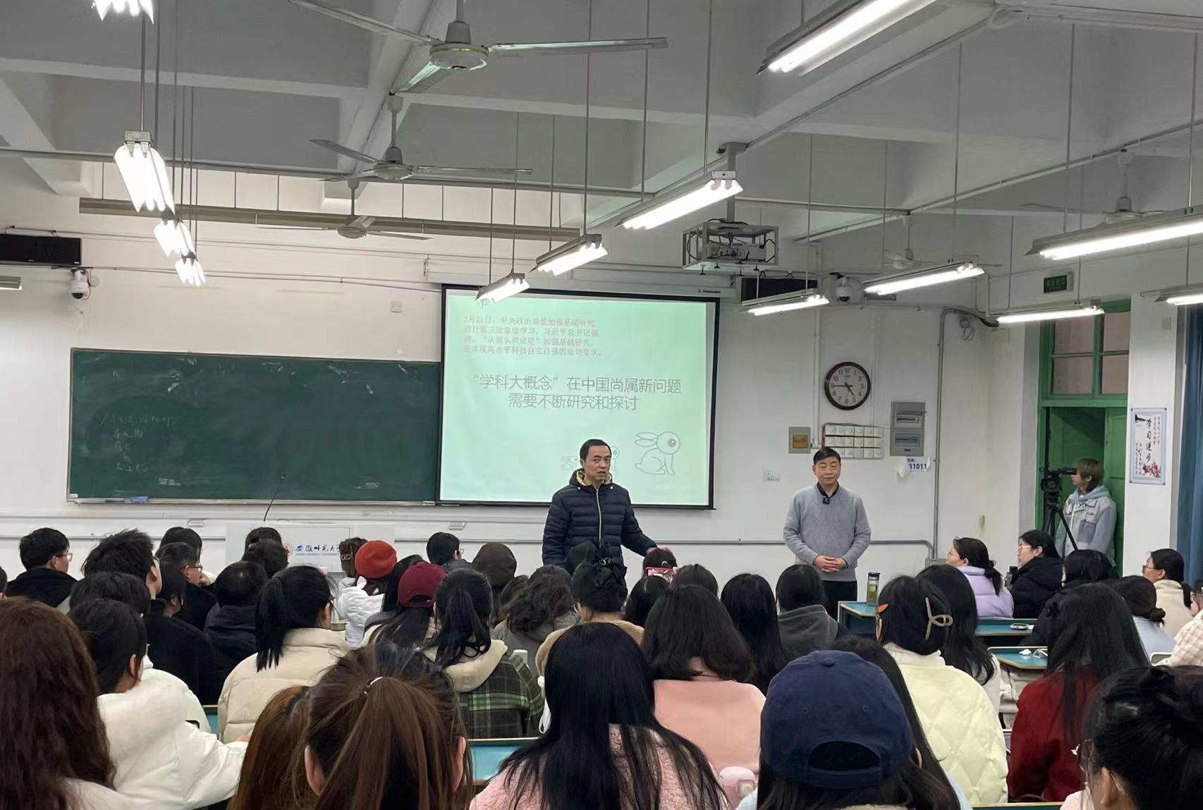胡家曙老师结合自身教学和研究经验,用严谨、平实的语言对中学语文教学界备受瞩目的“学科大概念”进行解释和剖析。讲座分为两个层次,在理论认知方面,胡老师从“学科大概念”的提出、“学科大概念”的位置、“大观念”的理解隔膜、“大概念”的表达形式等方面从理论层面揭示了当下教育界对于“大概念”理解的误区,厘清了“大概念”具体内涵。在实践落地层面,胡老师结合一线语文教师的课例,启发同学们找出其中对“大概念”理解的偏差所在,并以《故都的秋》所在的散文单元以及《窦娥冤》所在的戏剧单元为例,从基本问题、形成性评价、适切性、逆向设计等角度出发,演示了在中学语文教学中如何使“大概念”落地生根,具有极强的示范性和操作性。讲座进行了两个小时,在互动环节中,研究生们积极向胡老师请益,诸如核心素养与“大概念”之间的关系、语文教材文化性和语文性的关系以及教材处理方式等,胡家曙老师结合实际为同学们答疑解惑,取得了良好的效果。
