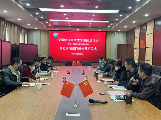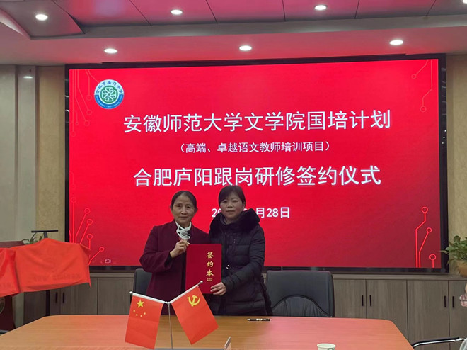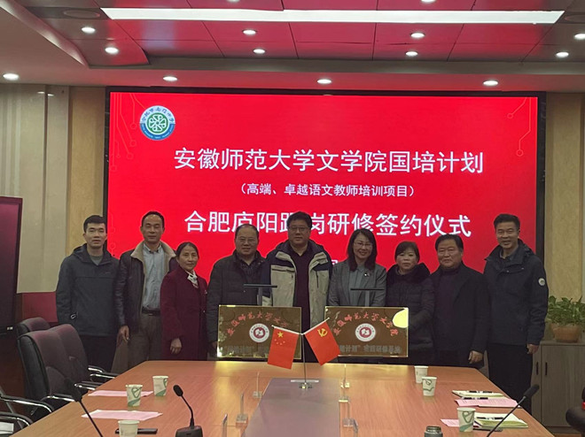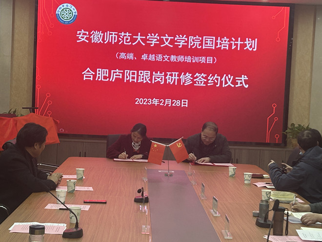 仪式上,戴鹏程和罗明霞分别介绍了两所学校的办学历史、育人理念和师资队伍情况,亦表示对后续跟岗研修工作给予全力支持。陈爱兰介绍了必赢线路检测3003no1承担“国培计划”高端引领人才语文教师培养项目的基本情况,并对此次合作表达了感谢。袁红卫介绍了庐阳区基础教育近年的发展状况,并对今后同必赢线路检测3003no1进行深度校地合作十分期待。随后,夏家顺解读了初中语文教师和小学语文教师跟岗研修方案。贾会明表示,参训教师不仅可以参加学校的教学教研活动,还可以享受与在职教师同样的教育教学资源,机会难得;后期,双方会进一步细化研修方案,确保研修活动做实做细,取得实效。最后,陈爱兰副院长与戴鹏程校长、罗明霞副校长签署了合作协议,贾会明副院长与袁红卫科长一同为必赢线路检测3003no1“国培计划”实践研修基地揭牌。