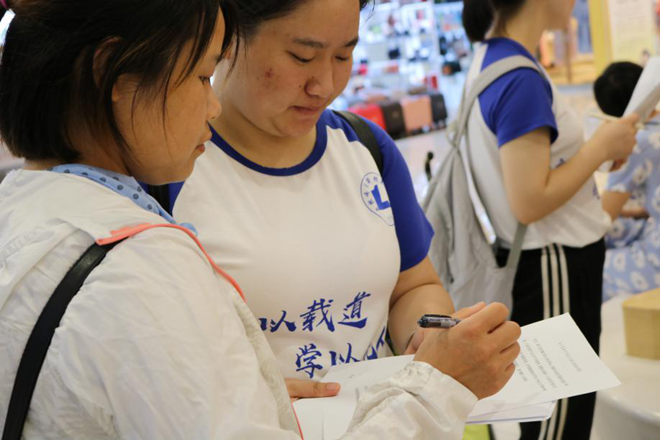 实践的第一天,队员们来到了伟星星悦广场,对普通民众开展了书法文化普及的问卷调查工作。相比于其他商业广场,星悦广场更靠近住宅区,各年龄阶段的人皆有,问卷调查的范围更加广泛。