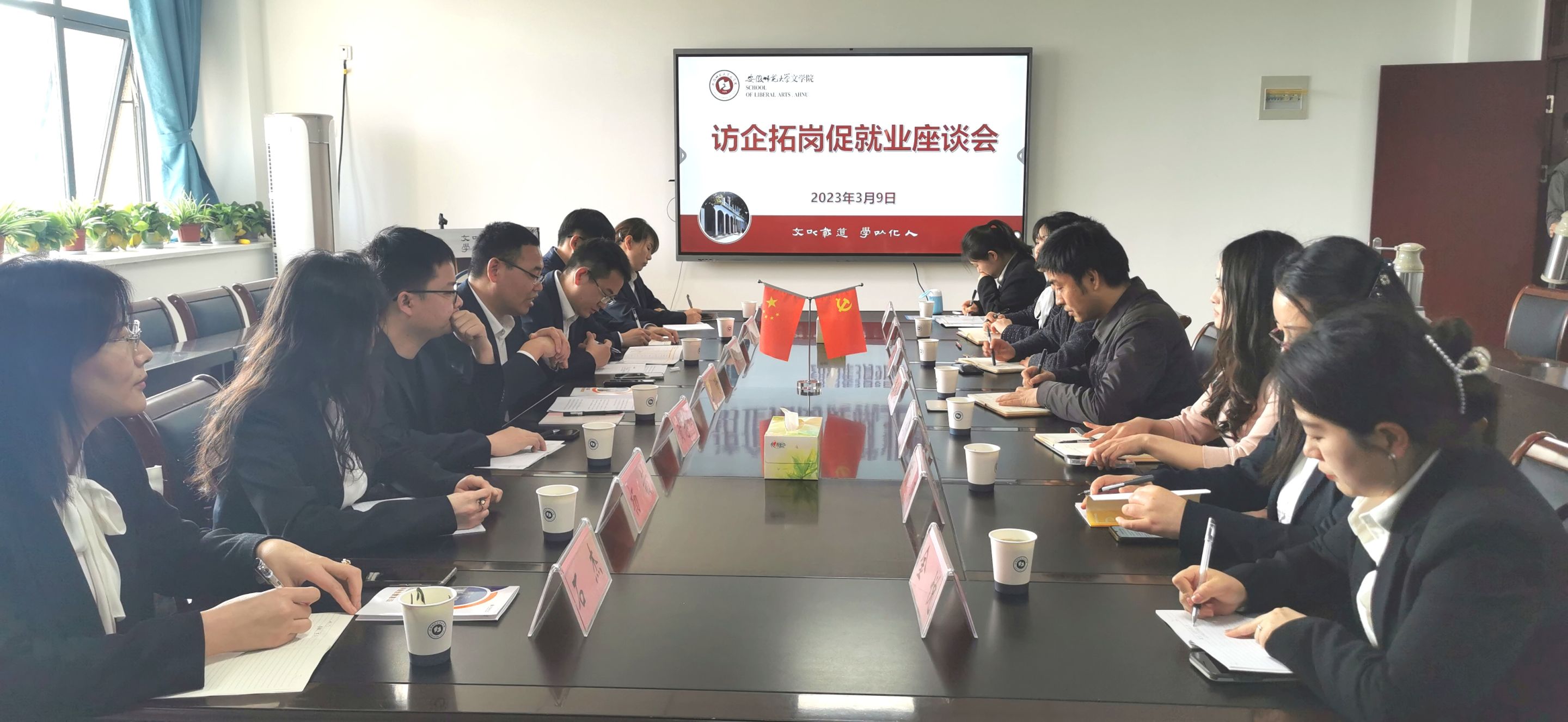 3月9日,学院与中铁四局集团及各分公司举行访企拓岗促就业座谈会。学院党委副书记(主持党委工作)戴和圣,党委副书记刘飞,2023届毕业班辅导员,以及各集团公司招聘负责人参加座谈。会上,刘飞致欢迎辞并介绍学院办学情况,希望双方发挥各自优势,进一步加强在人才培养、实习就业等方面的合作。中铁四局集团人力资源部吕琦表达了对学院人才培养质量的肯定。分公司代表蔡新磊结合自身实际情况,从中文系毕业生的角度讲述了文科生在企业的成长路径。与会人员还就增强人才培养与企业需求的匹配度等方面进行了深入讨论。戴和圣充分肯定了中铁四局的综合实力、优秀企业文化和人才培养路径,希望优秀校友能借助此次春招机会,以学长身份多和毕业生交流择业就业经验。
