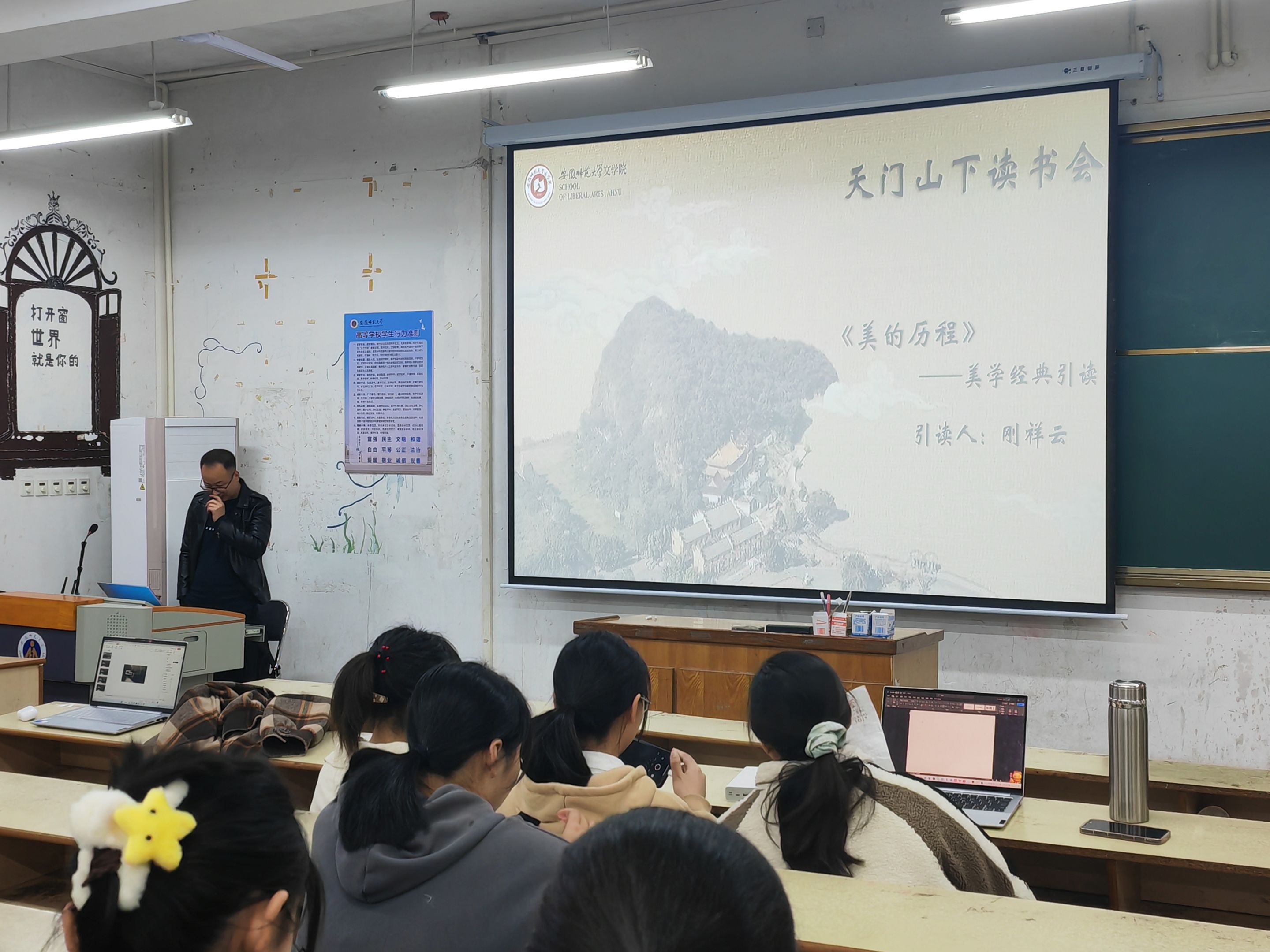在美学经典读书会上,主讲教师刚祥云首先就“读书与生活”之间的关系作了分享,表示要先学会生活,再懂得学习。他还以故事形式和幽默的语言风格,就本次经典引读《美的历程》这本书相关问题和同学们进行交流,期待同学们能够深入读下去,从而获得自己独特的感受,真正将经典阅读融入学习生活。