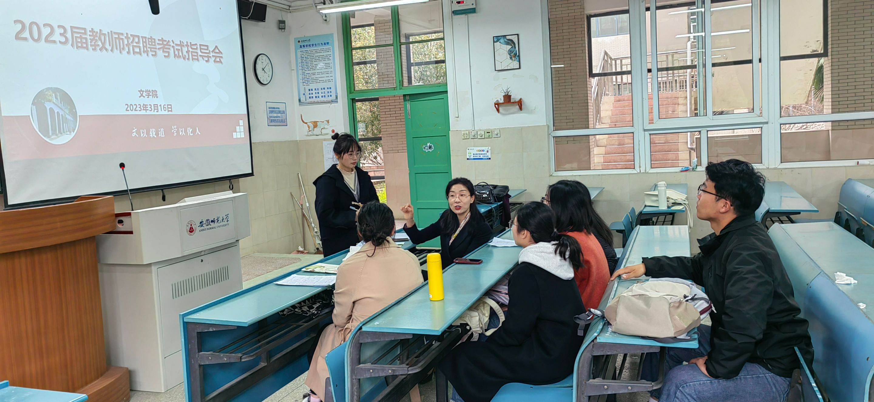 为有效提升毕业生求职面试能力,增强师范生教学技能,学院面向2023届毕业生开展教师招聘考试集中指导与分组实训。3月16日,学院邀请芜湖市骨干教师、正高级教师张晋作教师招聘面试专题指导,院党委副书记刘飞、实训指导老师、毕业班辅导员以及百余名毕业生参会。