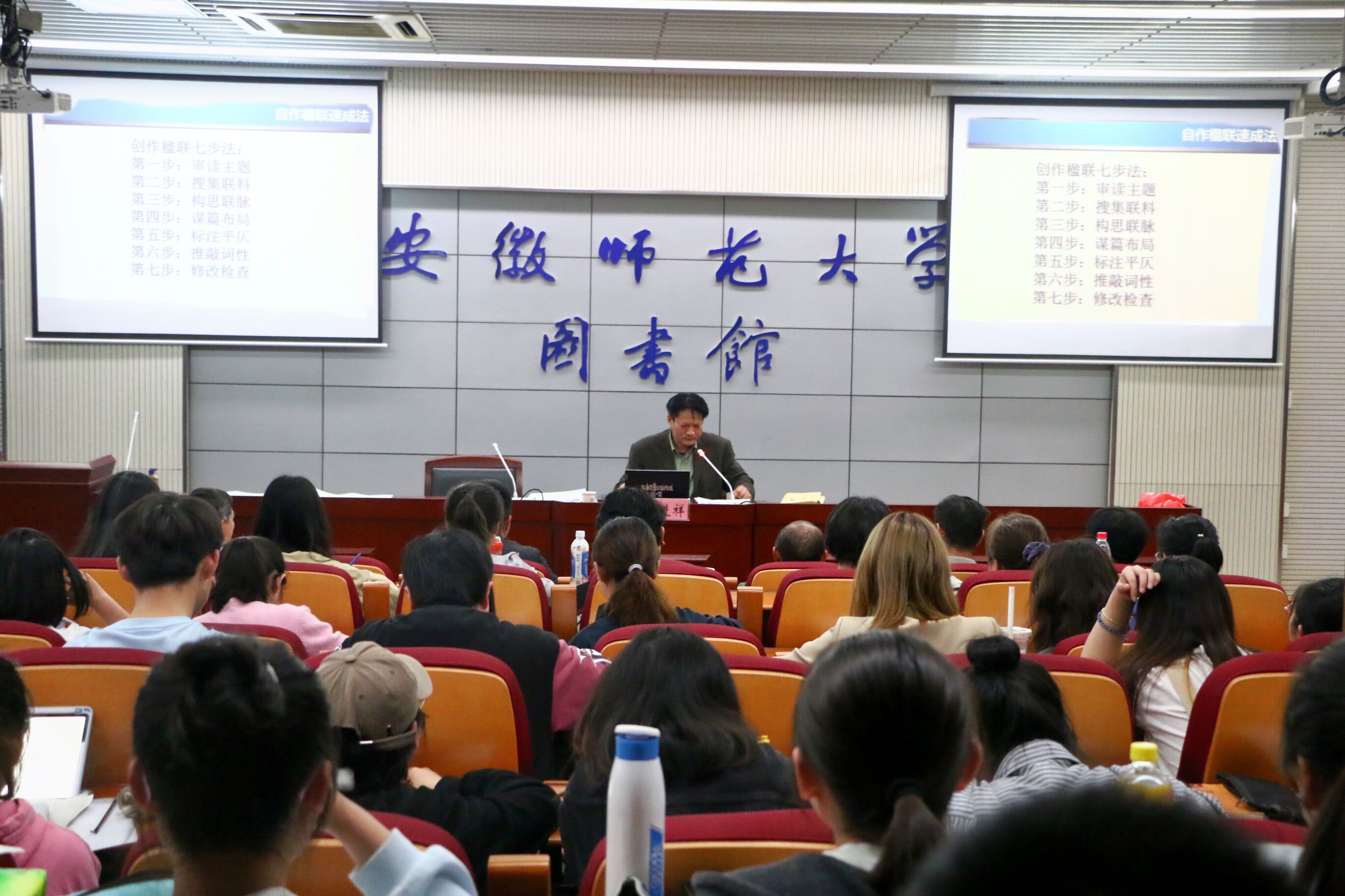 诗词楹联进校园,国学经典永流传。为引导学生学习中华诗词,传承中华优秀传统文化,4月13日,必赢线路检测3003no1邀请中国楹联学会副会长倪进祥做“如何快速学会自作诗词楹联”专题讲座。本次讲座由必赢线路检测3003no1张应中老师主持,芜湖市楹联学会会长陶能林、常务副会长孔军等相关负责人,必赢线路检测3003no1党委副书记刘飞,必赢线路检测3003no1学生代表,江南诗社、赭麓书画社部分成员参加讲座。
