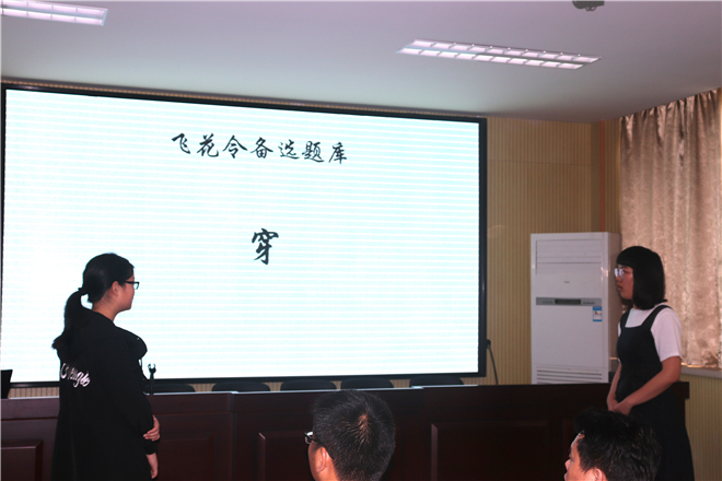 欲练英雄志,须明胜负多。经过初赛笔试的选拔,共十五位选手从近四百人中脱颖而出,进入决赛。决赛共分为三轮,第一轮知识问答,共有三小轮的激烈角逐,分数较高的六名选手将进入第二轮飞花令环节。在本轮的九宫格、填字题、综合问答等题目中,选手们绞尽脑汁,各展所长。最终,郭精金、柯涓涓、陈欢、李欣茹、曹晓言、王子薇六位选手顺利进入第二轮。在飞花令环节中,选手们两两对决,分别就“生”“思”“雨”“茫”等字轮流答出包含此字的诗句。经过一番激烈的比拼,郭精金、柯涓涓、陈欢凭借深厚的诗词涵养与灵敏的反应能力顺利进入冠军争夺赛。在最后的争夺中,三位同学用自己储备的丰富诗词进行了精彩的诗句接龙。最终,郭精金选手沉着应对,始终保持良好势头,获得了一等奖。柯涓涓、陈欢同学分获二、三等奖。