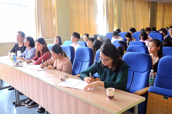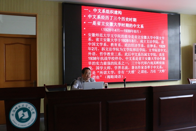 谢昭新老师从中文系经历的几个历史时期开始谈起,从省立安徽大学时期到国立安徽大学时期,向学员们阐述了每个时期的社会背景和治学动态。紧接着谢老师为同学们详细地梳理各个时期中文系聘任的教授名录,并介绍中文系的课程设置和教学改革,在中文系的历史沿革中,始终坚持关注学生的治学、品德教育,坚持以教学为中心,提高学生的科研能力,促进学生全面发展。谢老师就中文系的科研活动成果从学术讲座、学术著作、学术问题讨论等方面进行了概述,还从中文系学生的学术组织和社团活动入手,跟同学们畅谈诗社、话剧社的发展历程。