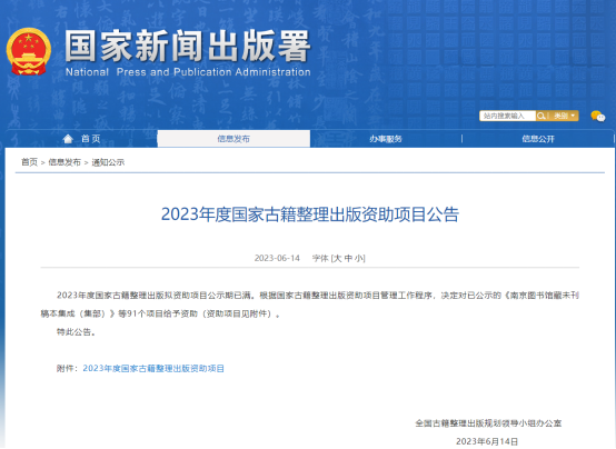 国家古籍整理出版资助项目由全国古籍整理出版规划领导小组办公室组织评选,主要资助具有较高版本价值、学术价值和文化传承价值,弘扬中华优秀传统文化的古籍整理项目,每年评审一次,2023年共立项91个项目。