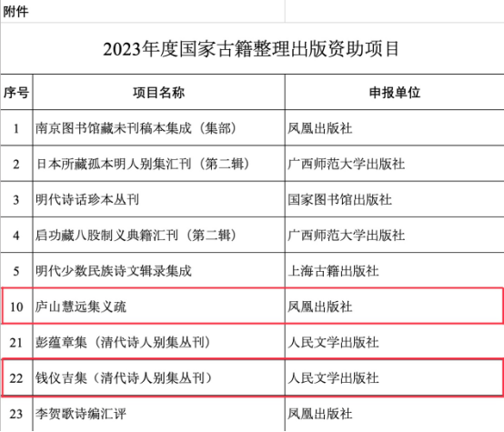 日前,国家新闻出版署公布了2023年度国家古籍整理出版资助项目,我院刘运好教授承担的《庐山慧远集义疏》(凤凰出版社申报)、任群副教授承担的《钱仪吉集(清代诗人别集丛刊)》(人民文学出版社申报)获得立项。
