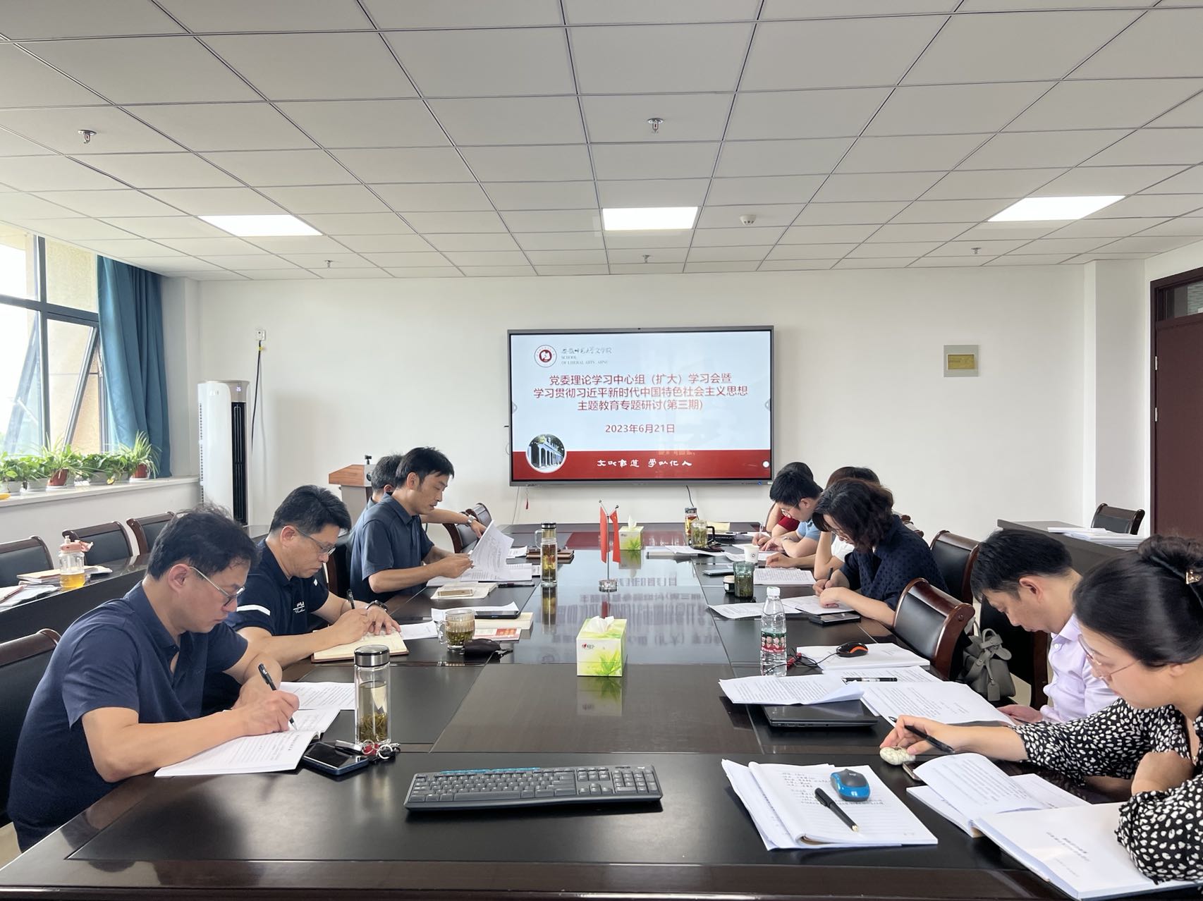 6月21日下午,必赢线路检测3003no1召开党委理论学习中心组(扩大)学习会,开展主题教育第三期专题研讨暨调研成果交流会,院党委委员、处级党员领导干部、党支部书记参加会议。会议由学院党委副书记(主持党委工作)戴和圣主持。