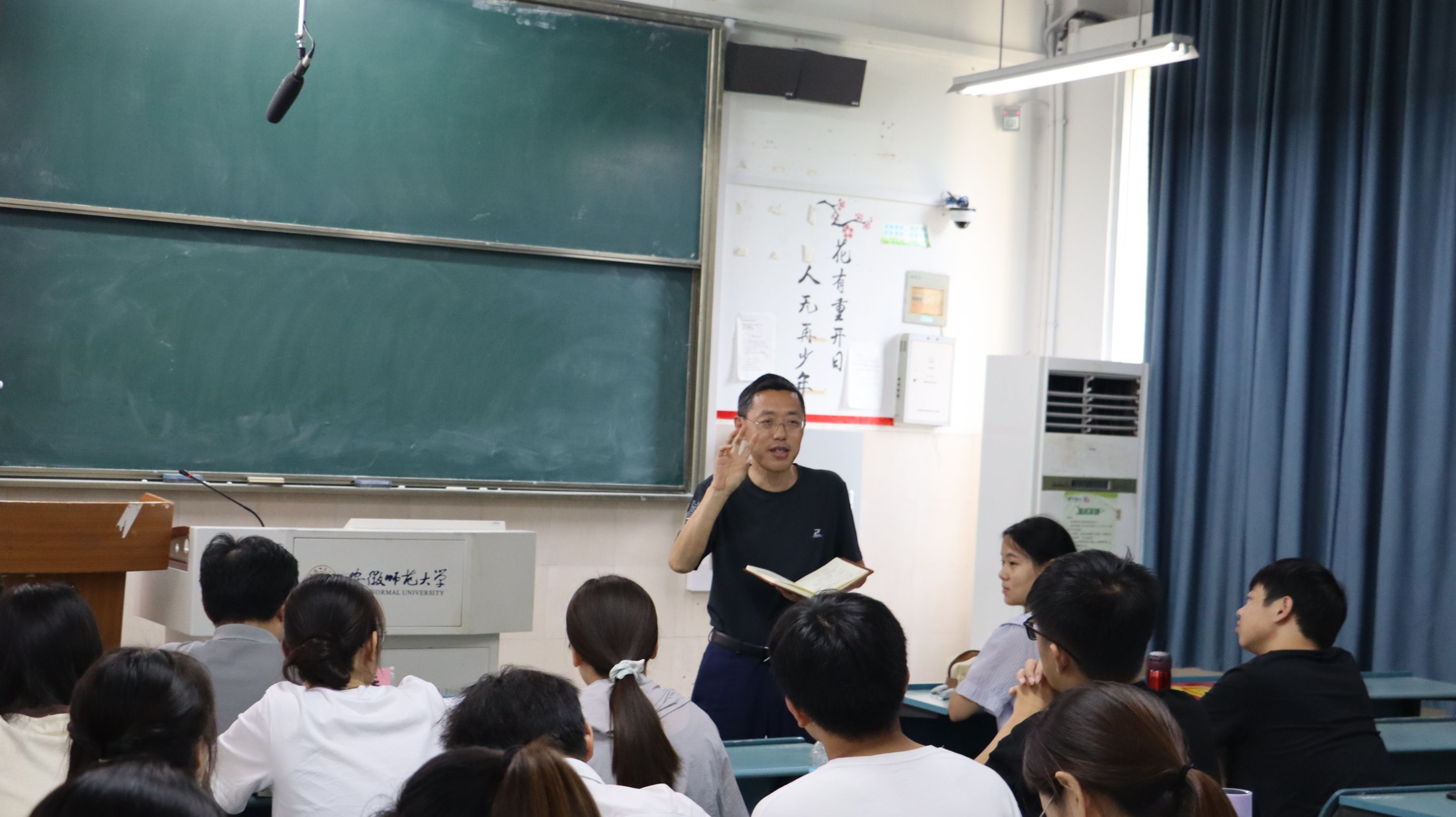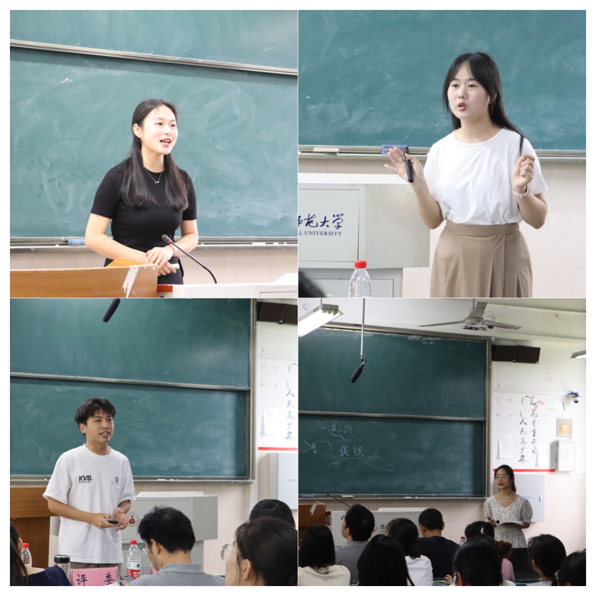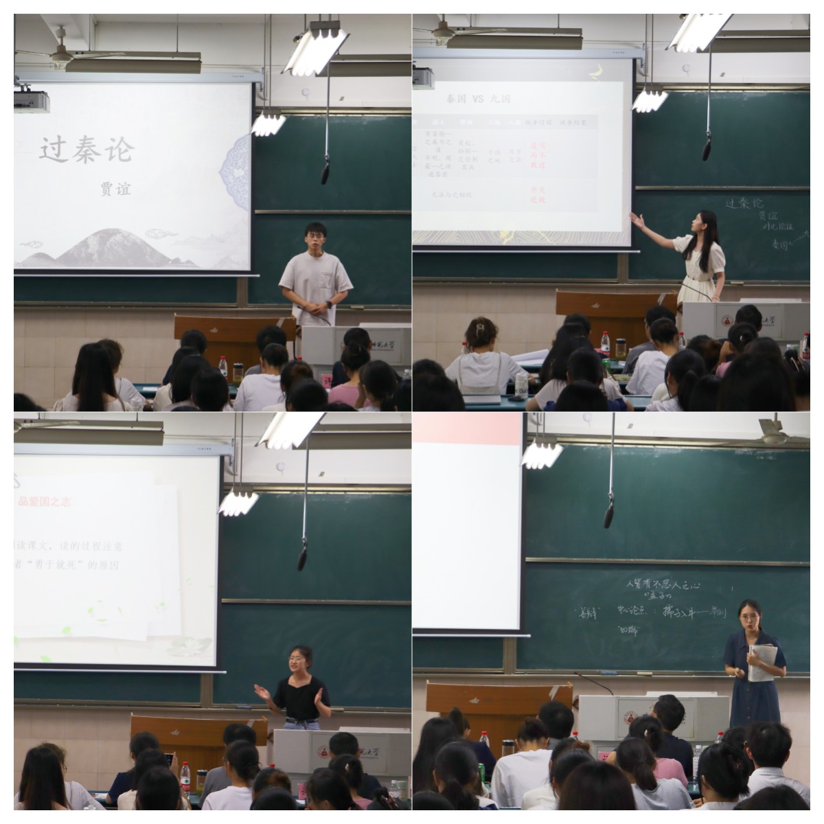 在模拟授课环节中,通过班级初选产生的18位参赛选手,从高中语文部编版教材中自选课题,精心准备,认真打磨教学设计和教学课件,在比赛中展示出独特的个人教学风采,赢得了在场评委老师和观观摩同学的热烈掌声。顾畑镐用板书巧妙设计一个“奴”字,分析了包身工是什么的问题;孙吉成通过对《赤壁赋》《念奴娇·赤壁怀古》的联读,深入探究了苏轼在黄州经历的脱胎换骨。其余同学或讲述《过秦论》,分析强大秦朝最终走向覆灭的原因,或用优美诗意的语言讲述《望海潮》,带领大家领略杭州风光。参赛选手皆以生动的语言表达、丰富多彩的课堂内容、良好的教姿教态展现了优秀的师范生专业素养。