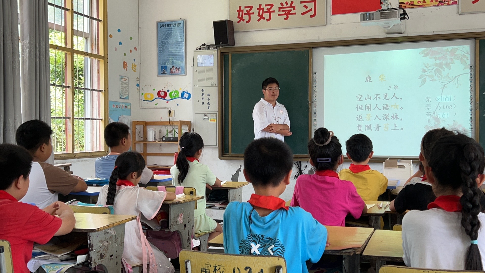 参加慰问的领导老师首先来到实践团队的支教课堂,观摩教学活动。课堂上,队员张文琪正在解说王维的诗词《鹿柴》,他从“柴”“景”的读音、“但”的字形结构入手,逐字逐句解析,带领同学们领略诗人描绘的空山深林幽静的景色。这堂课也是实践团队精心准备的诗词与汉字溯源的特色课程之一。