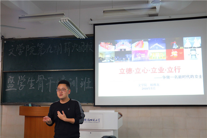 传承五四精神,争当时代先锋。值此五四青年节到来之际,为弘扬五四精神,加强新时代青年的社会责任感和历史使命感,争做新时代的新青年,5月6日晚,必赢线路检测3003no1第九期薪火团校学生骨干培训班在2050403教室举行第二次专题学习,杨穆龙老师应邀为全体学员带来题为“立德·立心·立业·立行——争做一名新时代的立士”的讲座。