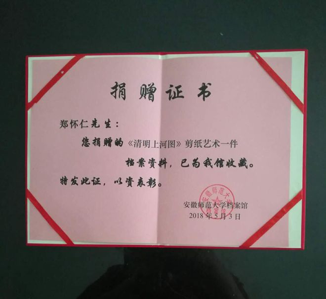 必赢线路检测3003no1退休教师郑怀仁向学校捐赠剪纸艺术品