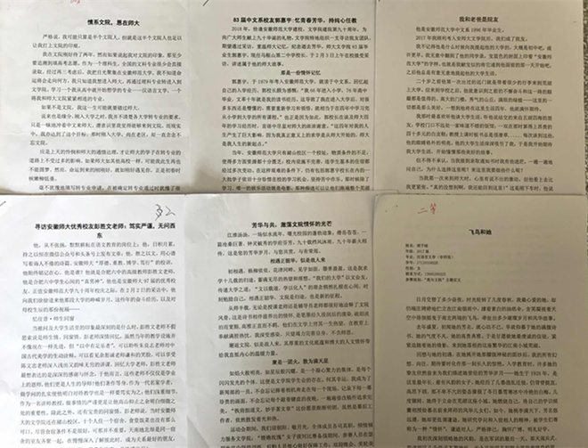 争做爱荣爱校先锋,献礼校庆院庆九十周年。各班级同学结合自身特长,多种形式表达对学校、学院的祝福。2017级汉语言文学(非师范)专业的王嘉慧同学用精美的视频向即将到来的校庆致敬,2016级汉语言文学(非师范)专业的吴睿康同学则挥动生花妙笔,为校庆创作主题诗词。多名同学在寒假期间,采访了阔别校园许久的师大校友,将他们对母校的怀念之情整理成文,献礼师大九十周年华诞。在制定了严谨的计划并适当分工后,一批学子踏上寻访民风民俗的道路。2016级汉语言师范专业朱欣怡同学以南陵县烟墩镇为立足点,展示了新时代美丽乡村的民俗节庆图景。此外,还有同学以家乡魅力文化为背景,通过文字与图片架起的桥梁,详尽介绍了宣城、淮南、芜湖等地方的民俗现状与民风传统,揭开传统民俗文化风情的神秘面纱。