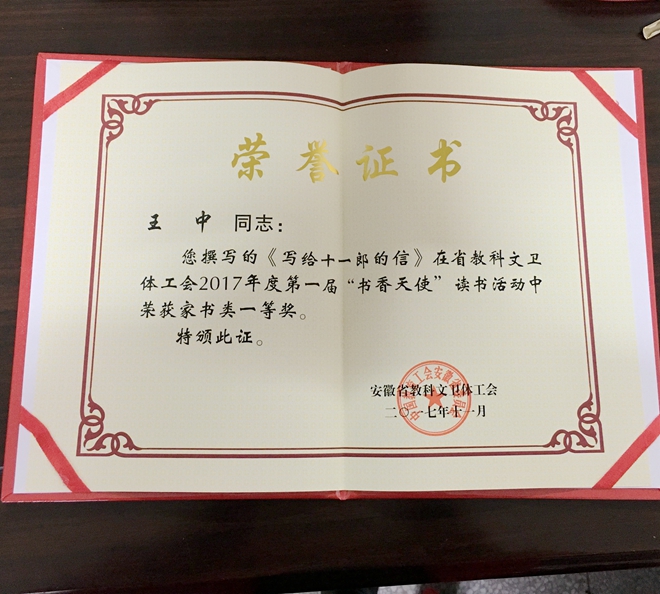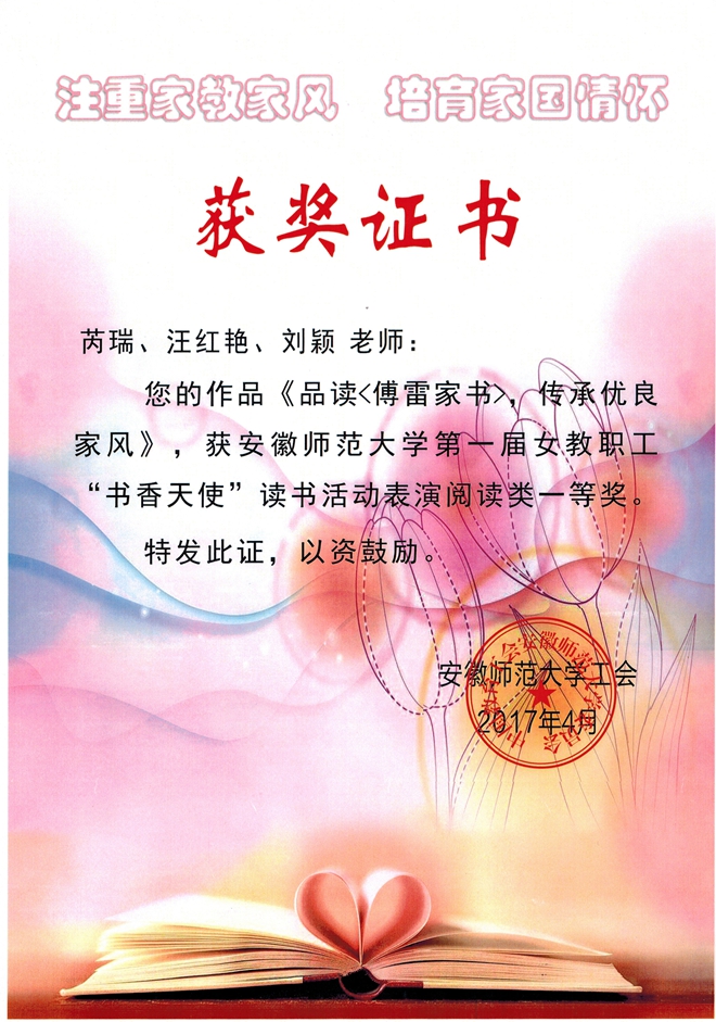 在校第一届“书香天使”读书活动中,必赢线路检测3003no1杨惠老师的《读万卷书,行万里路——家风无言》、王中老师的《写给十一郎的信》分别荣获征文、家书类一等奖;芮瑞老师、汪红艳老师和刘颖老师的《品读傅雷家书传承优良家风》获表演阅读类一等奖。获奖的优秀作品被选送参加全省教育系统第一届“书香天使”读书活动暨全国第五届“书香三八” 活动,分别获得征文类、家书类一等奖和视频类优胜奖。在安徽省教育工会2016年度“书香三八”征文活动中,必赢线路检测3003no1女教职工取得了优秀的成绩,杨惠老师的《与书为伴,做时间的玫瑰》、黄静老师的《最才的女,最贤的妻——杨绛先生的书香人生》、朱菊香老师的《快乐阅读》荣获征文一等奖。