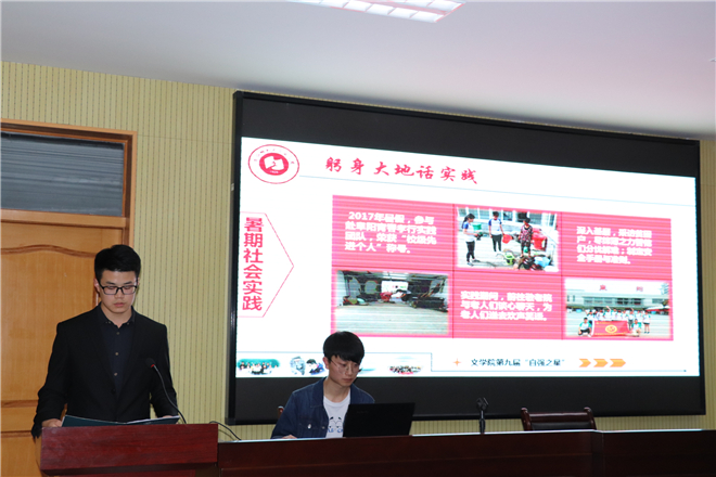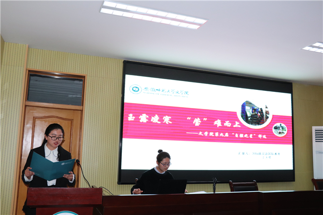 本次评选共有17名选手参加,参赛选手以PPT的形式向评委们汇报自己的奋斗经历,向在场师生展现青春的风采。来自17级汉语言文学非师范专业的曾其绒,面对困难,她选择“亮剑以战胜它们”;16级戏剧影视文学专业的王玲玲,面对家庭的困难依然不改初心,积极投身志愿服务活动,于风雨中等待破茧成蝶;来自16级汉语言文学师范专业的凌德喜,担任班级班长,始终以“从我做起,服务同学”为宗旨,真正体现了学生干部的担当与责任;一颗文心筑梦新时代,15级汉语言文学非师范专业的魏鑫鑫积极参加第二课堂素质拓展活动,前往偏远地区为贫困儿童送去温暖和希望;来自15级卓越语文班的陆欣,在逆境中坚忍不拔。她勤工俭学,成绩优异,获得了20余次院级及以上奖项,诠释了“自强”的内涵……“天行健,君子以自强不息。”选手们以饱满的感情将自己的成长经历娓娓道来,将自己的奋斗故事分享给在场的每一个人。