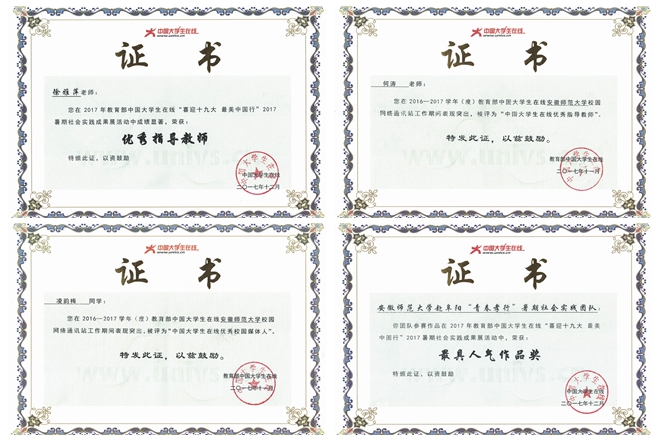 通讯站在年度评比中获“优秀校园网络通讯站”和“弘扬传统文化示范校”称号,两人荣获“优秀指导教师”称号,一人荣获“优秀校园媒体人”称号。在教育部中国大学生在线举办的2017年“喜迎十九大,最美中国行”暑期社会实践成果展活动中,必赢线路检测3003no1组建的“必赢线路检测3003赴阜阳‘青春孝行’暑期社会实践团队”荣获“最具人气作品奖”。