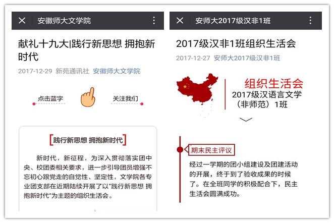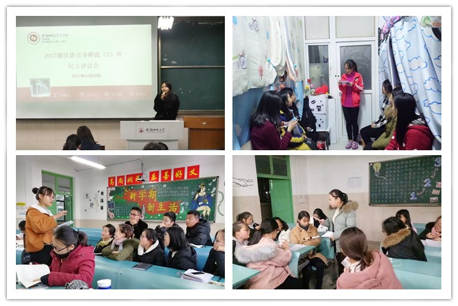 以班会为基础,思想引领明方向。各团支部组织开展主题学习、支部大会等,认真学习十九大精神。秘书学专业2015级团支部开展了“践行新思想,拥抱新时代”主题组织生活会,从组织主题学习、召开团支部大会、开展教育评议和做好运用结果四个方面,带领同学们深刻认识和了解团学和团建的内容及其重要性,进一步加强班级思想建设。2015级汉语言师范专业的同学在学十九大精神基础上,聆听团支书十九大精神主题宣讲,团员青年就十九大学习心得进行交流,从而更加深入、细致、全面地掌握十九大报告的精髓要义,也深刻感受作为新时代青年身上肩负着的神圣使命和责任担当。