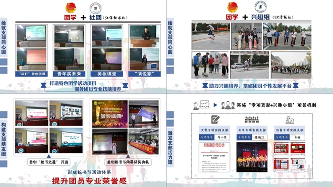 绘就支部同心圆。实施“团学+社团”共建模式,联合江淮秘书社,打造“秘轩”特色团课、青年实务秀、美妆课堂、“演说家”等团学活动项目,服务团员专业技能培养,助力兴趣培养,搭建团员个性发展平台。