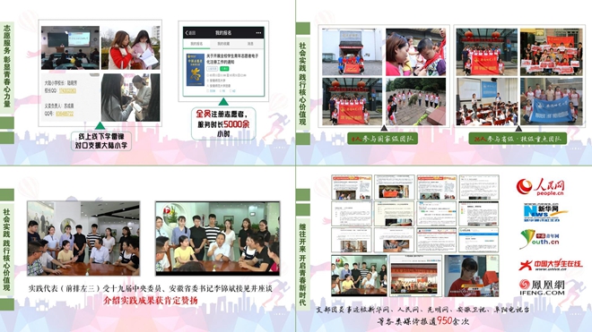 突出网络宣传影响力。开通官方微博、微信、QQ,开设思想引领、文化之声、素质拓展栏目,开展线上调研、直播,传播青年好声音。150期软文、380万话题阅读量、601条动态,安徽共青团、学校官微多次点赞。