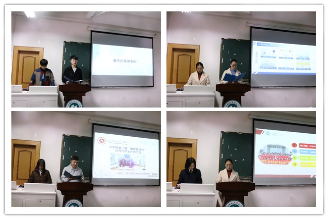39名选手在限时六分钟内结合PPT进行展示,他们致力于专业学习、党团建设、志愿活动、学生工作等多个方面,结合自身的学习和生活历程,展示青春路上的别样风景。大学是起点而不是终点,2016级汉语言师范专业的汪璇用自己的实际行动有力地阐释了这句话,参与暑期社会实践重点团队、综合测评位列班级前列、各种奖项20余项,多项优秀成绩向我们呈现了她在大学生活中的蜕变与进步。2015级汉语言非师范专业的郭精金立足日常阅读,在阅读中找寻自我价值,在诗词竞赛中的优异成绩及知识竞赛中的不俗表现都见证着他的努力。我用文艺为大家带来欢乐,舞台就是我绽放的地方,2016级卓越语文实验班班袁伊佳用多彩的文体活动为自己的大学生活绘上斑斓色彩。2015级秘书学专业的方铭将学习与实践相结合,参加职业规划比赛、运行新媒体微信平台、提升office技能、参加各类文学竞赛,立足专业,一步步地提升自己的综合能力,“秘书之星”就是她的代名词。不同的风景,一样的青春活力;不同的方式,一样的精彩。同学们倾耳注目,精彩处响起阵阵掌声,每一次掌声响起都是对他们的认可与肯定。