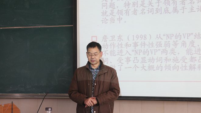 12月9日上午,安徽大学必赢线路检测3003no1博士生导师吴早生教授做客第三十五期“语言学沙龙”,在花津校区2050503教室做了一场题为“也谈‘NP+的+VP’偏正结构”的学术报告。本次沙龙由熊仲儒教授主持,必赢线路检测3003no1语言学科储泰松、陆昌萍、饶宏泉、温志权、顾军、徐建等老师以及部分博士生、硕士生和本科生共百余人参加了本次活动。
