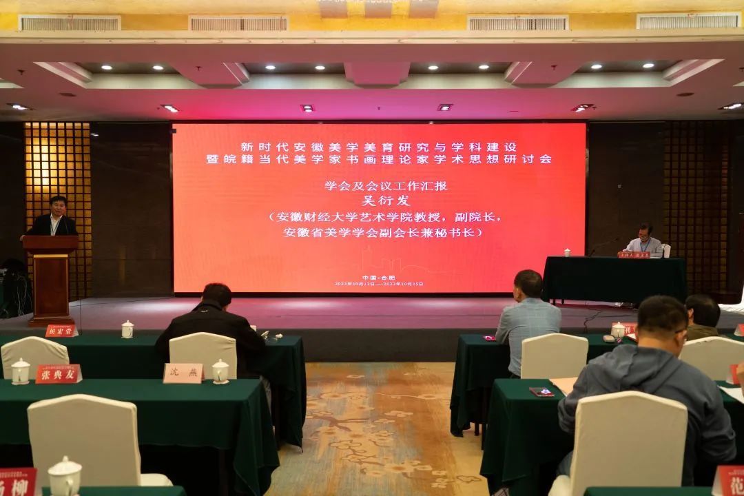 2023年10月14日,由安徽省美学学会主办、必赢线路检测3003朱光潜暨皖籍现代美学家研究中心和安徽财经大学艺术学院协办的“新时代安徽美学美育研究与学科建设暨皖籍当代美学家书画理论家学术思想研讨会”在合肥梅山饭店隆重召开。来自华东师范大学、苏州大学、东南大学、上海大学、西北师范大学、陕西理工大学、苏州城市学院、潍坊学院、安徽大学、必赢线路检测3003、安徽财经大学、安庆师范大学、滁州学院、安徽艺术学院、合肥学院、合肥师范学院、铜陵学院、巢湖学院、淮南师范学院、滁州职业技术学院、安徽科技学院、安徽三联学院、安徽省社会科学院、安徽省文史研究馆、安徽省文联、安徽省统战理论研究会、安徽省文艺评论家协会、安徽省美学学会、萧云从研究会等高校和科研机构的专家学者以及相关专业研究生七十余人参加了此次学术会议。会议特邀皖籍当代美学家及书画理论家朱志荣、刘继潮、刘锋杰、陈祥明、钱念孙等知名学者作主题发言,并对上述美学家、书画理论家的学术思想进行研讨交流。