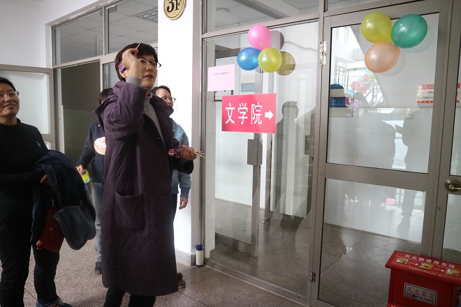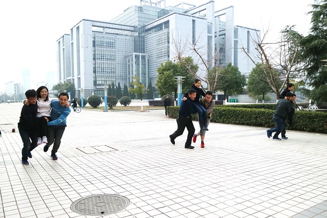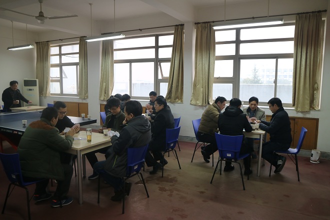 下午时分,阳光温暖,微风和煦,在行政楼前的空地上,首先开始了三组选手在“跳长绳”项目上的较量,经过激烈的角逐,教师三队组最终获胜。在接下来的“抬新娘”环节中,凭借高水准的团结协作能力,王昊、项念东、汪晶三位老师获得本项目第一。随后进行的是室内项目“夹鸡蛋”,在规定时间内,选手用筷子夹住乒乓球至另一盆内,数目多者获胜,戴和圣与汪红艳二位老师拔得头筹。“投飞镖”比赛中,徐雅萍与杨惠二位老师以78环的成绩并列第一。最后进行的是四人一组“通俗桥牌”项目,这既是比赛,又是游戏,紧张与轻松的氛围并存,让参赛选手沉浸其中。比赛现场欢声笑语不断,其乐融融。