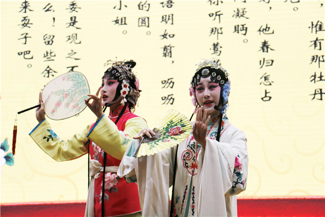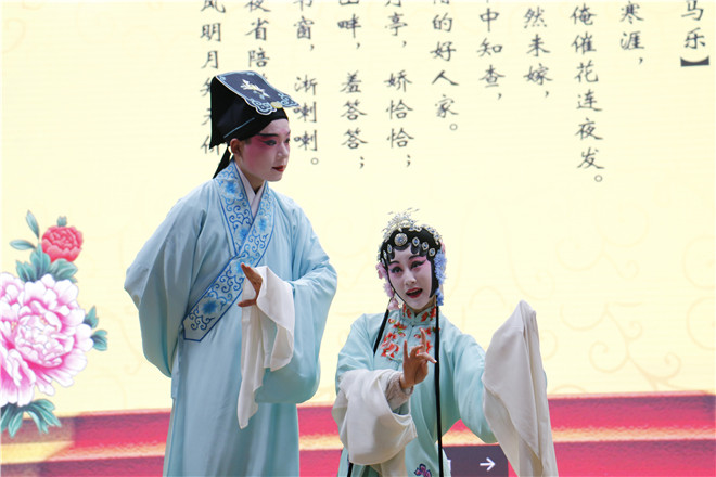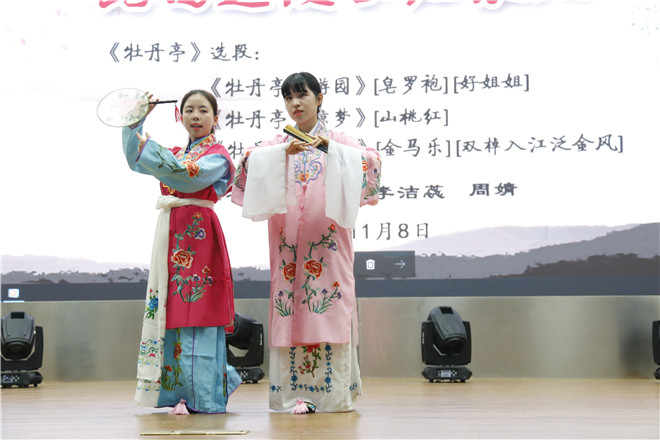 最后一个环节是汇报演出。来自17级汉语言文学和17级戏剧影视文学的新生徐淑婷、熊孙倩戏服上场,为观众们表演了自学的【皂罗袍】和【好姐姐】两支曲子。吕福海老师给予充分肯定,连口称赞“很棒!很棒!”