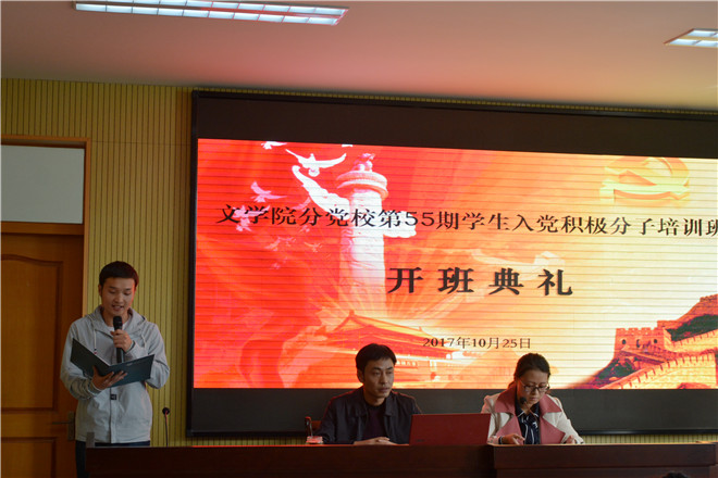 开班典礼在庄严的国歌声中拉开帷幕。班主任孙霁雯首先向学员介绍培训班学习、考核等制度规范,要求学员提高思想认识、深刻领会参加入党积极分子培训班的重要意义,树立正确的入党动机,充分发挥模范带头作用,端正学习态度,保证学有所思、学有所获。学员代表、2015级汉语言文学(非师范)专业的郭精金代表全体学员对党组织的培养表示衷心感谢,并承诺一定不负党组织期望,勤奋学习、积极实践、严于律己,以最饱满的热情、最全面的投入、最实际的行动来完成党课学习,争取早日成为一名真正合格的党员。戴书记对经过重重选拔参加培训的入党积极分子表示热烈祝贺,勉励学员在新的时代里把握每一次发展和进步的机会,树立高尚的道德情操,并在日常生活中发挥先锋模范作用,将个人的理想、目标同带动和影响身边人结合起来,不断加强党性修养和锻炼。