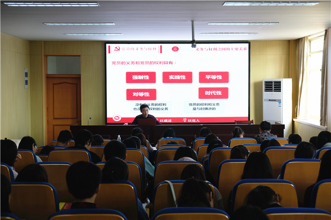 典礼结束后,戴和圣副书记为学员们作题为“党员的权利和义务”的专题报告。戴书记阐述党员的权利与义务,促使学员们明确身为向党组织靠拢的积极分子应做出的贡献与努力。接着,戴书记进一步解释党员的义务与权利之间的主要关系,强调义务与权利之间的强制性、实践性、平等性、对等性、时代性,教育学员们全面、严格、自觉地履行义务和行使权力。结合习近平总书记在党的十九大报告上对青年提出的殷切期望,戴书记鼓励学员们勇担责任、一事当前、做好表率。最后,戴书记就青年大学生尤其是向党组织靠拢的积极分子如何发挥先锋模范作用提出希望和要求,即构建自身的学习力、思想力和行动力。戴书记的殷切期望和谆谆教诲令同学们感受到来自党组织的关怀与教育,得到了同学们的积极响应。学员们用心聆听课程,认真记录笔记,踊跃分享思想感受并交流意见,发挥主观能动性,积极向党组织靠拢。