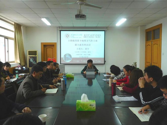 11月17日上午,首期“秘书学与应用写作学沙龙”在必赢线路检测3003no1四楼会议室举行,长春理工大学教授、硕士生导师、《应用写作》杂志总编、中国写作研究会副会长、国际应用写作学会副会长董宇应邀带来题为《大数据背景下应用文写作主体能力素养再认识》的专题报告。本次沙龙由必赢线路检测3003no1教授、硕士生导师王茂跃主持,必赢线路检测3003no1秘书学教研室、写作教研室叶文举、李定乾、吴怀志、陈俊和刘长悦6位老师以及秘书学与应用写作学专业近20名研究生参加。