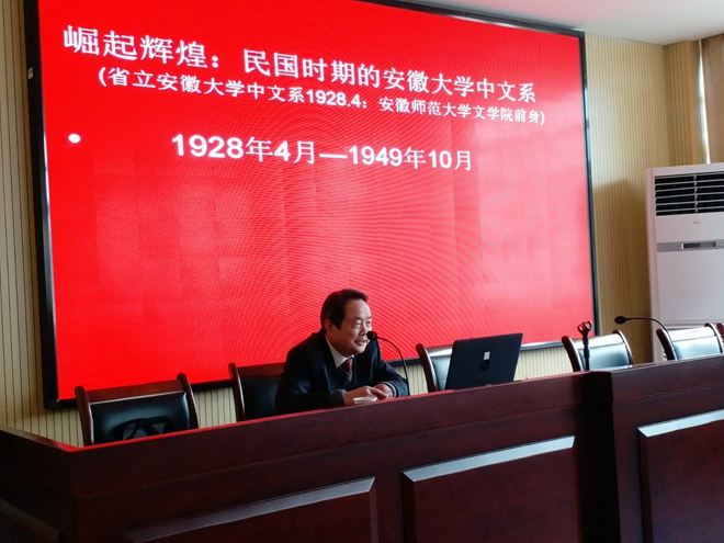 谢昭新教授以《崛起辉煌:民国时期的安徽大学中文系》为题,从中文系的组织构建、中文系的师资队伍、中文系的课程设置教学改革、中文系的科研活动以及学生的学术组织、社团活动五个方面,详细介绍了民国时期中文系的知名院长及雄厚的师资队伍,全方位展示了中文系的办学理念和人才培养情况。最后,谢昭新教授指出中文系是省立安徽大学办学最早、实力最强的院系之一,寄语全院教职工要“不忘初心、务实创新、砥砺奋进、再创辉煌”。