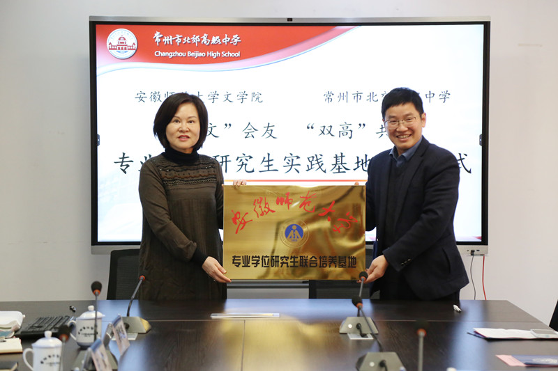 在常州市北郊高级中学,双方举行了“以文会友 双高共建——专业学位研究生实践基地签约仪式”。北郊高级中学党委书记房宏、副校长沈臻、教师发展中心主任季正华、学生发展中心副主任王俊等出席仪式。会上,双方就研究生培养工作进行了深入交流,并签订了“专业学位研究生实践基地”协议。