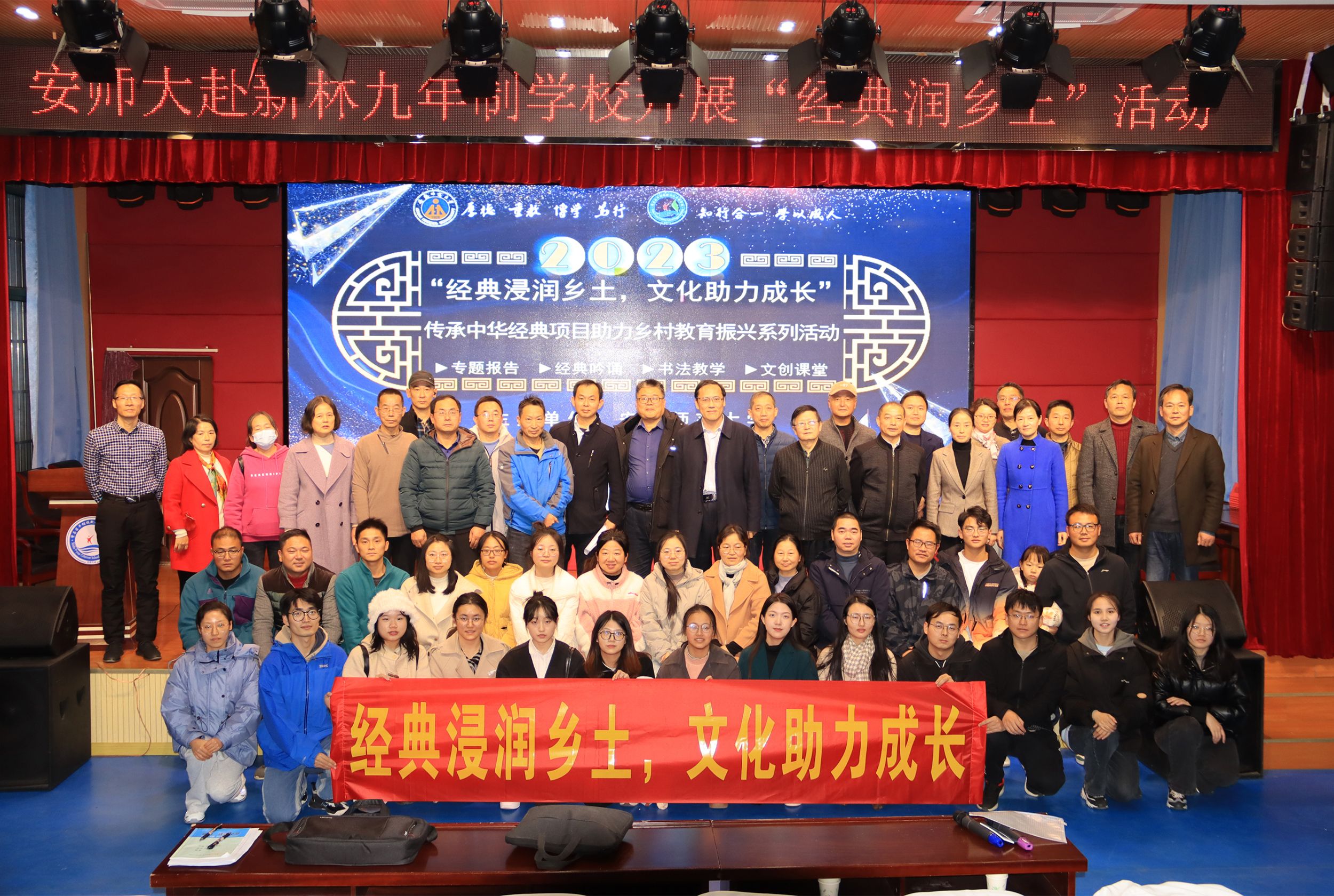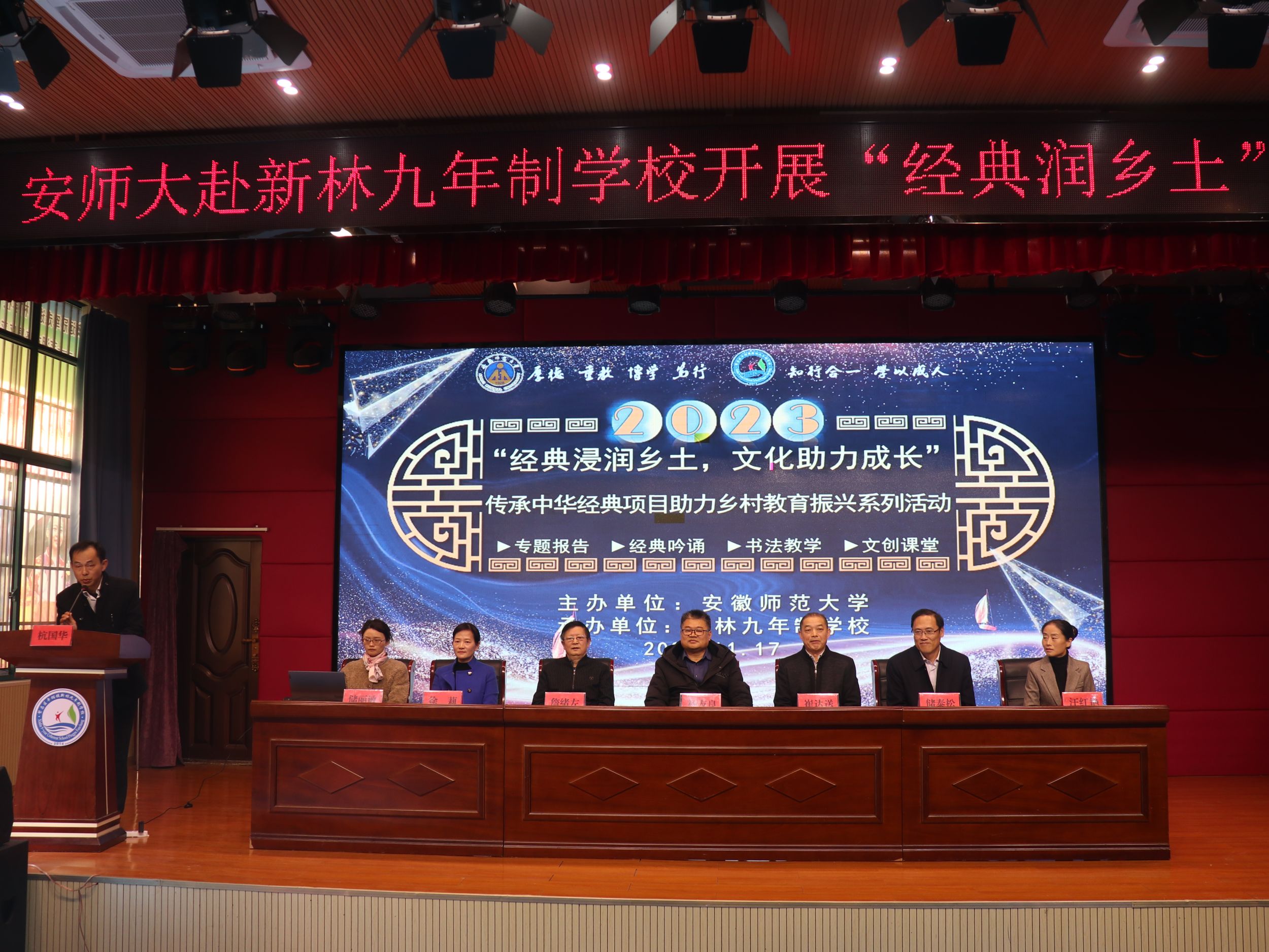 为响应国家传承中华优秀传统文化经典的号召,促进中华经典文化在乡村浸润传播,提升乡村学校教育教学水平,丰富乡村语言文化生活,11月17日,我校国家语言文字推广基地对口芜湖繁昌区新林九年制学校开展“经典润乡土”系列实践活动。基地副主任储泰松教授、基地教师詹绪左教授、崔达送教授、汪红艳副教授、徐莉副教授、储丽敏老师带领志愿者团队参与此次活动,新林九年制学校领导班子、相关学科教师全程参与,全面展示了我国传统经典的魅力。