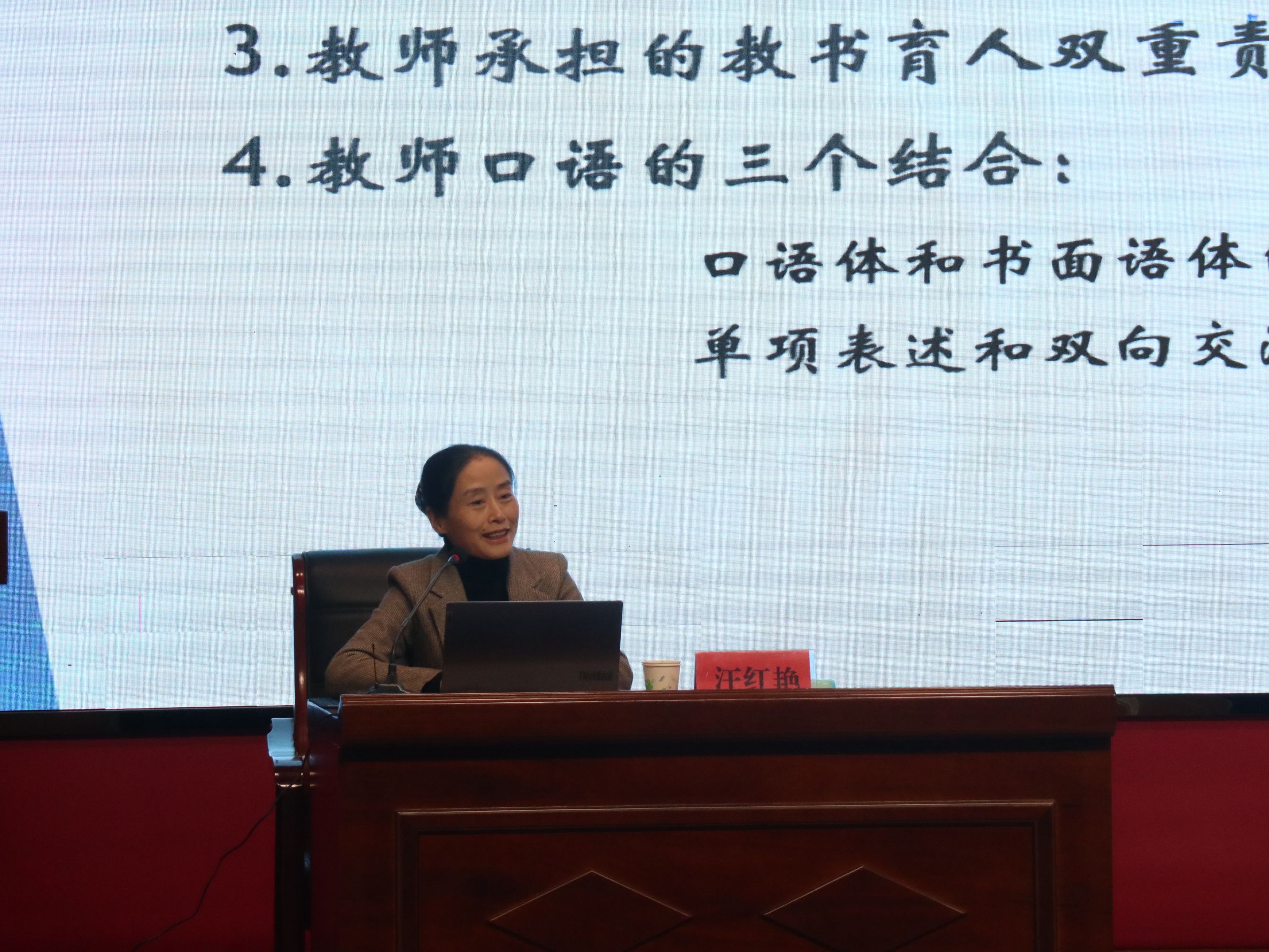 为增强地方教师的课堂教学语言技巧,经过前期调研,崔达送教授、汪红艳副教授开设了专题讲座,对当地师生进行普通话以及教师课堂语言艺术的培训。通过解读经典文本,加强了现场听众对于文本内容的理解,并现场进行了经典作品的示范性诵读;其间还穿插了绕口令等传统语言训练环节,进一步提升了当地教师的吐字与科学发音的能力,从而令课堂最终达到“言声意”三者的和谐统一,给现场师生带来了一场美的享受。