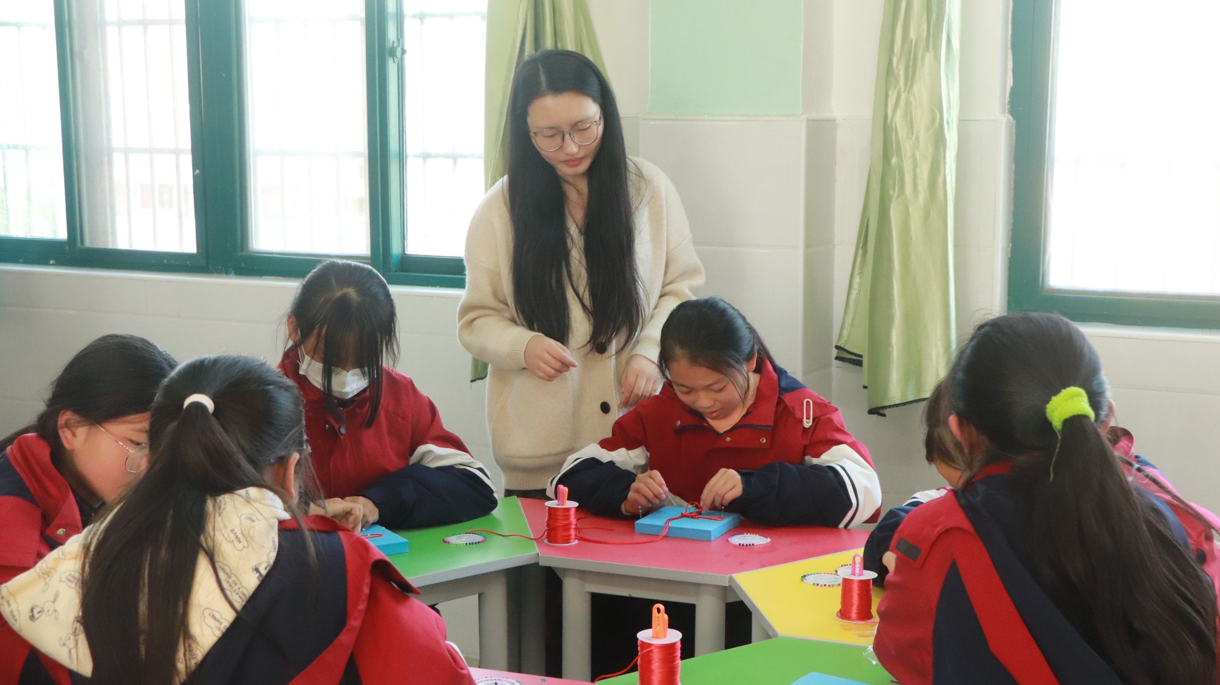 为增强学生对于中华优秀传统文化的认识,团队还开设了吟诵和编织中国结的课程。志愿者许欣雨、郭宇婷以《诗经·关雎》为例进行了吟诵的示范教学,让小朋友们在重章叠句的吟唱中进一步感受到中华优秀传统文化的魅力。教学结束后学生们围着志愿者久久不愿离开。而志愿者宋馨怡、赵文婷为学生讲解了中国结的起源,并介绍了几种常见的中国结类型,引起了现场学生们极大的兴趣。学生们迫不及待地制作起来,并在课程结束后向志愿者们展示了他们的制作成果。