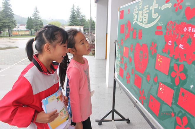 “死去元知万事空,但悲不见九州同”“黄金百战穿金甲,不破楼兰终不还”7月1日上午,大别山里风雨呼摇,但北中小学校园内回荡着的朗朗书声却响彻山间。孩子们目光坚定,端坐桌前,跟随志愿者老师们齐声诵读。“同学们,知道为什么老师带你们朗诵这两首诗吗?”小老师向孩子们问道,孩子们疑惑的摇摇头,接着队员林嘉炜充分发挥自己所学专业知识,从诗歌创作背景、诗人生平、意境及现实意义等角度多方面阐释了《示儿》和《从军行》,引导学生在全面理解诗歌的同时,深入感悟当下“爱国”内涵。在高级班中,成员史璐瑶和周亚萍则结合七一“香港回归二十周年”的节点,带孩子们了解香港回归历史后,以“关于七·一,大家会想到什么呢?”这一问题引出他们对于七·一的理解,带领大家用剪纸的方式表达自己眼中的“七·一”:孩子们有的剪出了形象生动的紫荆花,有的剪出了“闪闪发光”的五角星,还有的还剪出了蛋糕和礼帽,在体悟学习传统剪纸技艺的同时更用自己的双手表达了对祖国的祝福。