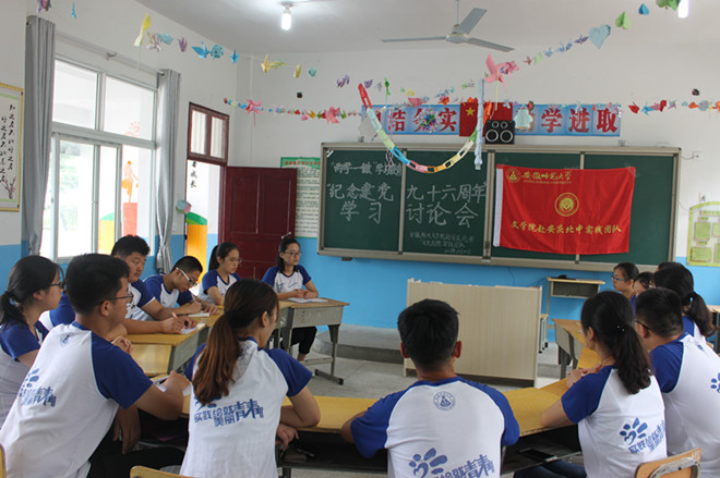 6月30日,由团队3名党员和14名团员成立的临时党支部、团支部举行了“【两学一做】学习教育之‘庆祝建党九十六周年’”学习讨论会。团队指导教师汪旭首先带领大家学习了“一带一路”“中国梦”“工匠精神”等“100个十八大以来的新名词”,并在学习后观看《共产党员请重温:我是谁》宣传片。看完视频后,志愿者们结合“创新演绎传统文化”的实践主题,就“如何在社会实践的过程中充分发挥党员的先锋性”这一问题展开讨论。学生党员朱子豪说:“作为一名党员,我们要充分发挥党建带团建的作用,与团队里的团员通力合作,发挥自身优势,激发孩子们学习传统文化的兴趣”。团员志愿者们也纷纷发表自己的见解,“共青团员作为党的后备军,更应积极向上,用自己的青春为山区教育注入活力,努力做合格团员”志愿者陶新雅说到。讨论结束后,党员志愿者们带领团员们探讨在北中小学开展以“童眼看七·一”为主题的“庆祝七·一”活动的具体细节。