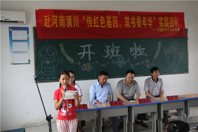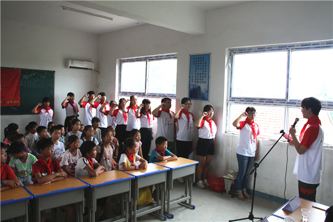 上午九时,开班仪式在整齐、响亮的国歌声中准时开始。孩子们行少先队礼,一个个都站得笔直,神情认真且专注,歌声稚嫩而清脆。接下来,喻老师对我们此次的社会实践活动给予了高度评价,他说,青年大学生有热情、有干劲、有知识、有想法,以自己的能力和所掌握的知识,为基层教育注入新鲜血液,是实现个人社会价值的有效途径。同时,也对我们的实践活动提出了建议和期待,他希望我们能走到最贫困的地区去,深入每家每户,对情况特殊的孩子进行一对一的帮扶。喻老师还指出,社会实践不仅是要让孩子们学到知识,更重要的是要提升青年大学生的综合素质,真正做到“受教育,长才干”。他建议队员们深入红色文化腹地,依托潢川县、光山县、新县等革命基地的资源,通过参观纪念馆、走访民间村落等形式,学习、传承革命精神,提升自己的精神境界。