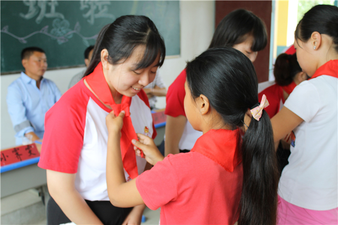 “老师,我系得好看吗?”小男孩有些局促,压低了声音偷偷问道。志愿者弯下腰“好看,你系得最好看了。”孩子们踮起脚,把鲜艳的红领巾系在志愿者的脖子上。孩子们把他们的一颗赤子之心用红领巾传递给了我们,也许他们系得并不是最好看的,但是他们的真心却是最可贵的。