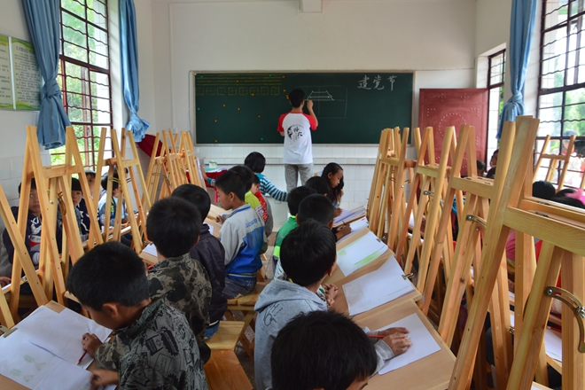 嘹亮稚嫩的童音从白云半隐着的垭口小学二年级教室内传出。绘画课上,孩子们的“糖老师”和“包老师”正手把手的教他们为闲置已久的后黑板绘上板报。开窗明路,志愿者们通过手中的画笔,将孩子们心驰神往的圣地——北京天安门,画在黑板上,印在心尖上。