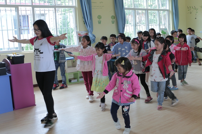 在垭口完小的两间梦想教室,不大的场地站满了三到五年级的50余名学生。在这里,志愿者们轮流为孩子们教授“我的祖国”音乐课和“舞动中国”舞蹈课。稚嫩的嗓音、欢脱的步伐,开心的笑声,在欢快优美的旋律中,孩子们放松身心,律动起来。
