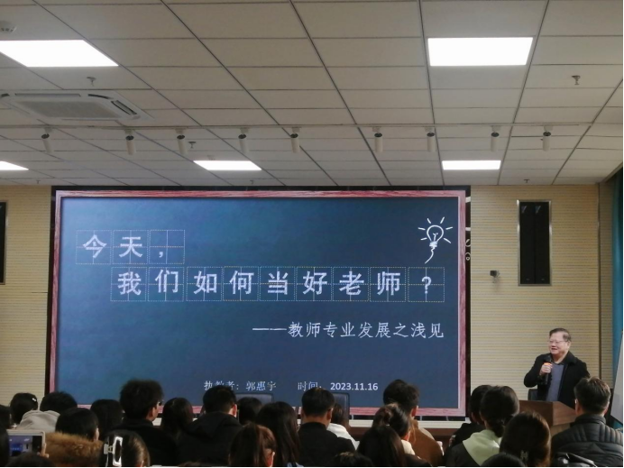 郭惠宇老师以自己的从教经历开启讲座,在四十年教育心路历程的回顾中展现了“坚定自己,下决心当个好老师”的职业追求和道德操守。郭老师认为,随着课程改革的深化、大数据时代的到来、高考制度的改革以及智慧校园的建设,教师专业能力提升成为新时代教育发展的迫切要求。做一个好老师,不仅要提升自身的职业品质,还要提高自己的职业境界,通过不断地教学教研来提升专业素养。郭老师从“以课本到课程:建构教学的立体空间”“从经验到科研:增强学科的专业成色”“从教学到教育:拥有洞察的职业眼光”“从个体到团队:搭建提升的互联网落”“从课内到课外:拓展无限的生活外延”等五个角度解读了“如何当好老师”这一极具实践意义的话题,分享了“一日一阳明”等精彩的项目课程案例。郭老师主张,语文教师要肩负文化传承的使命,积极投身课程改革,迎接时代挑战,建构有意义、有特色的语文课程。他强调,坚持读书是教师专业发展的必经之路,教学反思是教师专业发展最常规的方式,课例研讨是教师专业发展最有效的途径,研讨交流是教师专业发展的重要契机,课题研究是教师专业发展的重要方式,论著撰写是教师专业发展的重要台阶。他勉励同学们要深思“教育究竟为了什么”,要坚信“教育是奠定教师专业信念的基石,并且直接决定了教师生活方式的价值取向”。