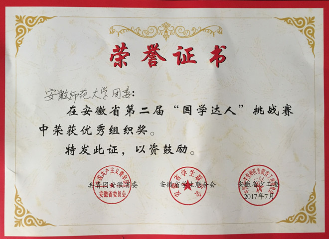 青通社讯(文/图 徐雅萍)76日至7日,由共青团安徽省委、安徽省学生联合会、安徽省少工委联合主办的安徽省第二届“国学达人”挑战赛在宿州举行。我院熊树星同学以全省第三的成绩荣获大学组“探花”称号。